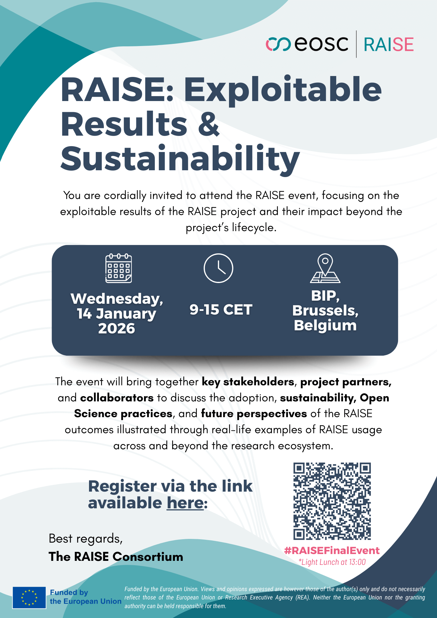The event is particularly relevant for Brussels-based stakeholders working on EOSC, Open Science, FAIR data, research infrastructures, data governance, innovation, and policy. Participants will have the opportunity to engage in discussions on uptake, collaboration opportunities, and next steps for ensuring the lasting impact of RAISE outcomes.